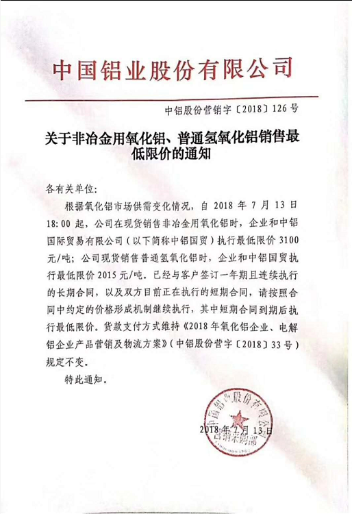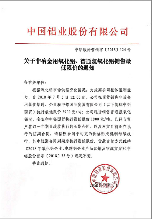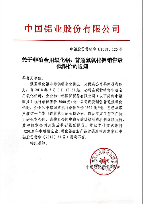 -7月13號,中鋁本月第三次發(fā)布最新非冶金用工業(yè)氧化鋁、普通氫氧化鋁銷售最低限價的通知,所執(zhí)行最低限價分別為3100和2015(元/噸)。此前,中鋁在7月5日和6日已連續(xù)兩次通知提高最低限價,非冶金氧化鋁和普通氫氧化鋁限價分別從2900和1900調(diào)整至3000和1950(元/噸)。