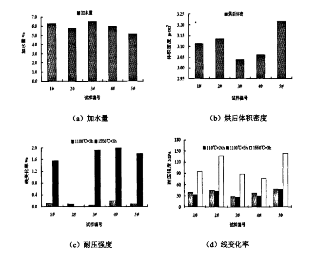 按照設(shè)計(jì)配比將骨料和高溫氧化鋁粉配料混合,加入適量水?dāng)嚢柚敝辆哂泻线m的流動(dòng)性。在室溫下振動(dòng)成型(測(cè)定物理性能的試樣尺寸為40mmx40mmx10mm及50mmx50mm×50m),自然養(yǎng)護(hù)24h脫模,放置48h后,進(jìn)行110℃x24h烘干處理。分別于1100℃和1550℃保溫3d燒成。按照相應(yīng)的國標(biāo)行標(biāo)檢測(cè)各項(xiàng)指標(biāo)。